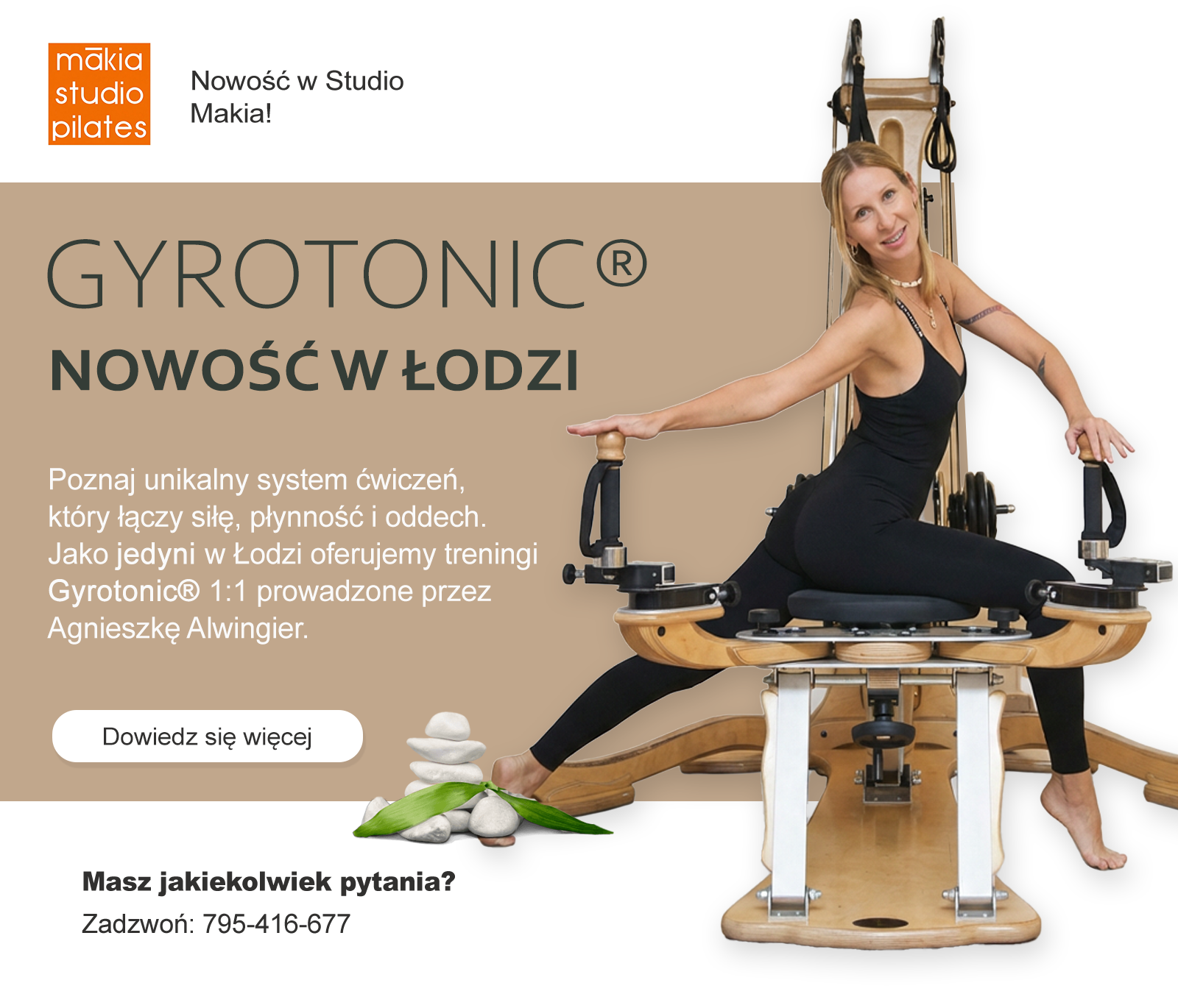 Jako pierwsi w Łodzi wprowadziliśmy również treningi Gyrotonic® – wyjątkowy system ćwiczeń na specjalnym sprzęcie, który łączy płynność ruchu z głęboką pracą mięśni.